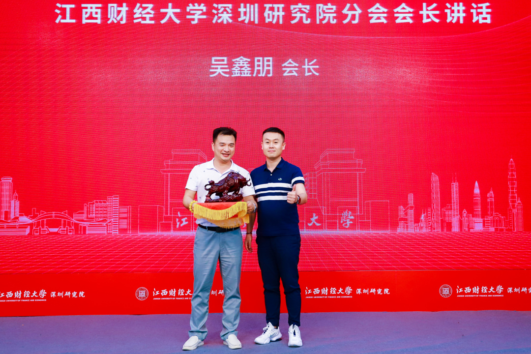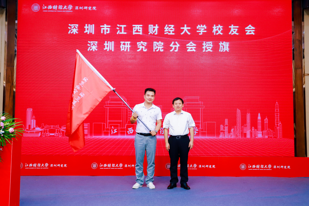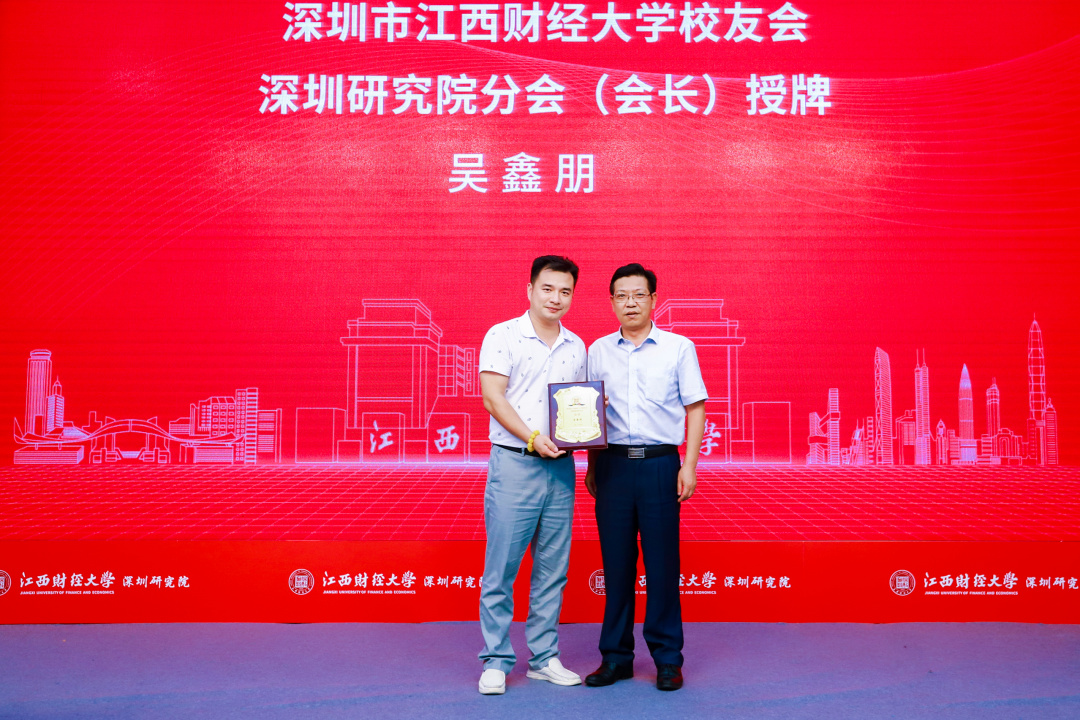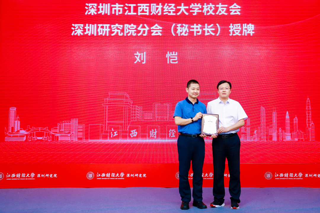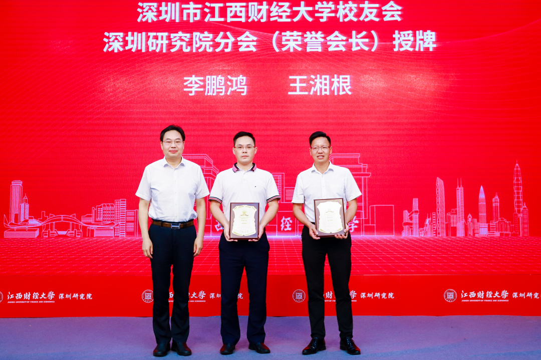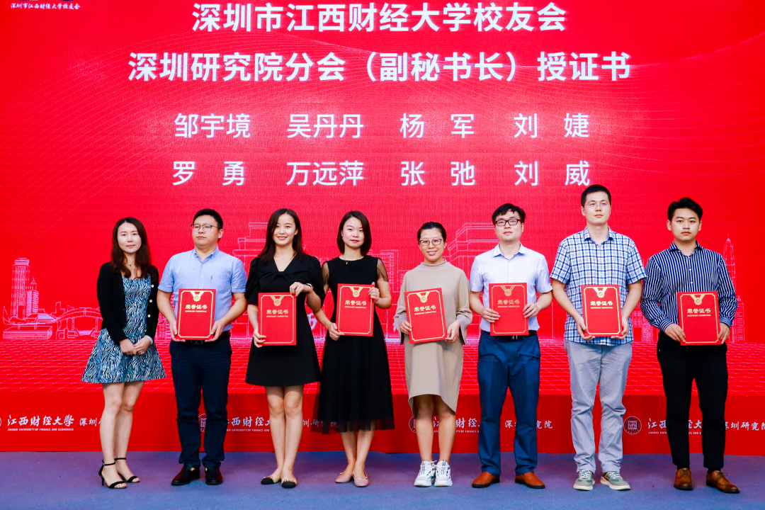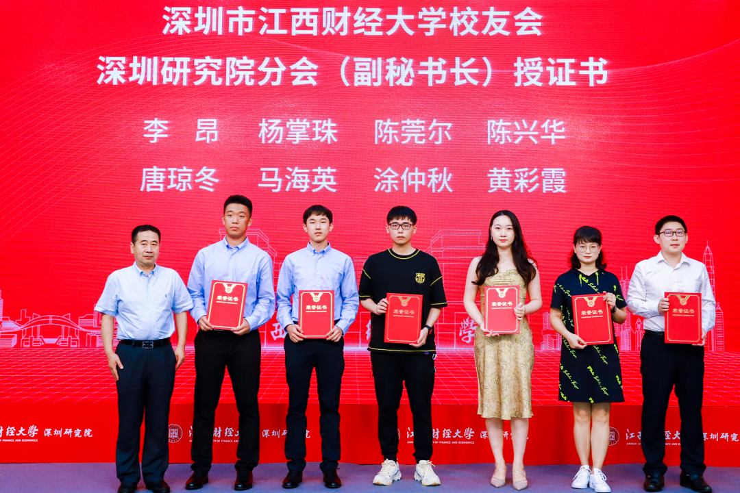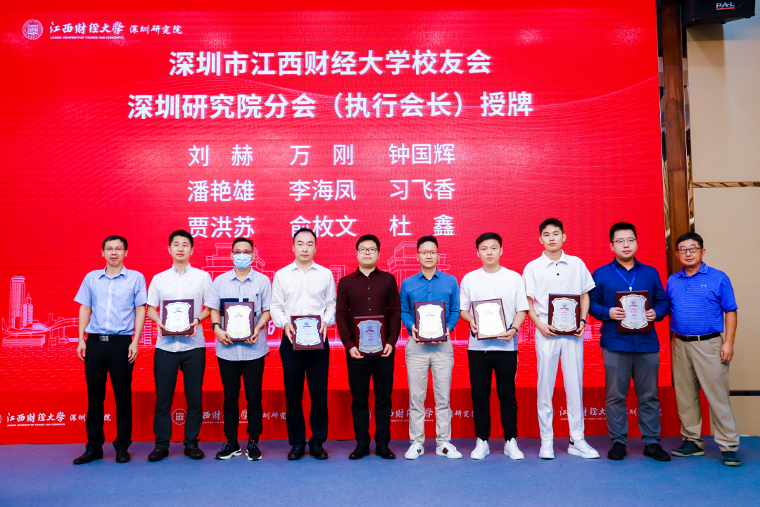 江西财经大学党委书记卢福财教授、副校长袁雄教授、副校长袁红林教授、深圳校友会会长李发勇、会计学院院长周冬华教授、工商管理学院院长胡海波教授、法学院院长杨德敏教授、法学院蒋岩波教授、深圳研究院办公室主任罗丽老师为深圳研究院校友分会主要成员授牌。