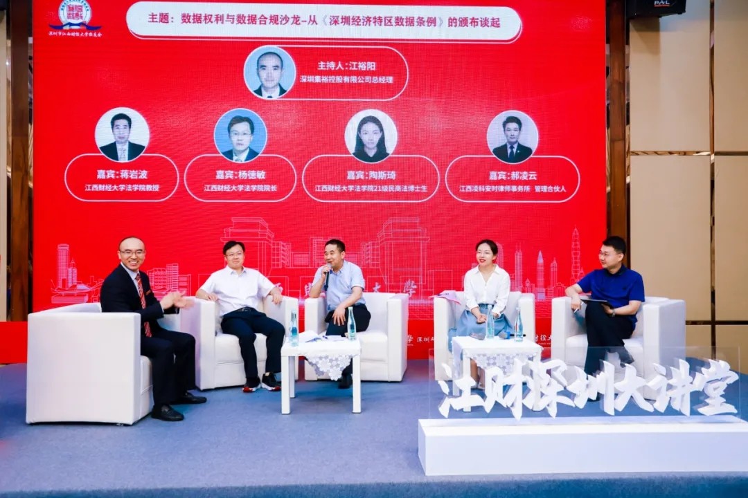 主论坛之后的沙龙活动由杨德敏教授、蒋岩波教授,以及2021级民商法博士生陶斯琦和江西凌科安时律师事务所管理合伙人郝凌云(由饶振邦律师代为出席)4位专家针对数据权利与合规性的问题,分别提出了自己的见解,并共同探讨了如何完善数据权利和隐私保护机制。江西财经大学后续还将组织师资力量为《深圳经济特区数据条例》的顺利实施提供更多科研支持和人才保障,同时为深圳经济建设贡献财经智库。