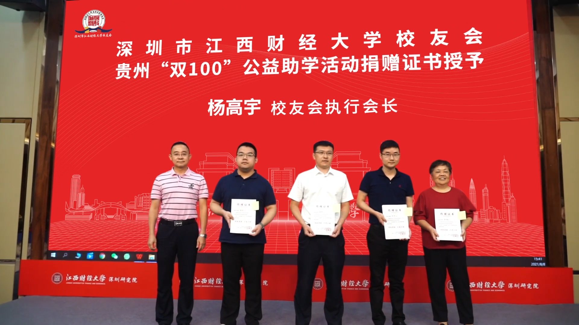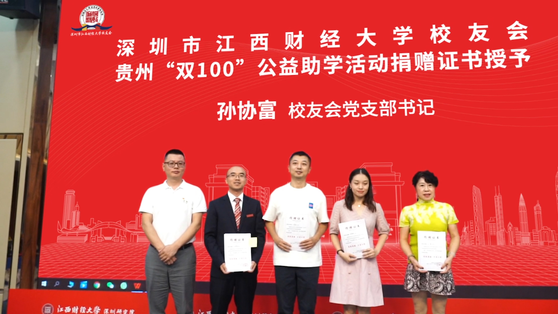 深圳校友会致力于公益事业,今年年初将对贵州黔西家庭困境儿童进行资助列为重点工作,截止到六月份已经完成筹款20万的目标,并已经按学年发放资金到100名受助对象手中。本次活动为100名捐助校友颁发了“深圳市江西财经大学校友会贵州‘双100’公益助学活动”捐赠证书,由深圳校友会执行会长杨高宇和党支部书记孙协富代表助学工作领导小组为各分会秘书长颁发。助学工作领导小组还将于今年九月份组织校友赴贵州看望受助的家庭困境儿童,并开展下一步公益资助活动。