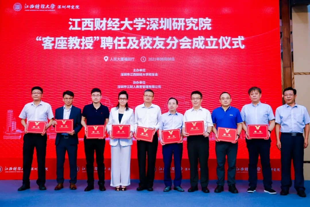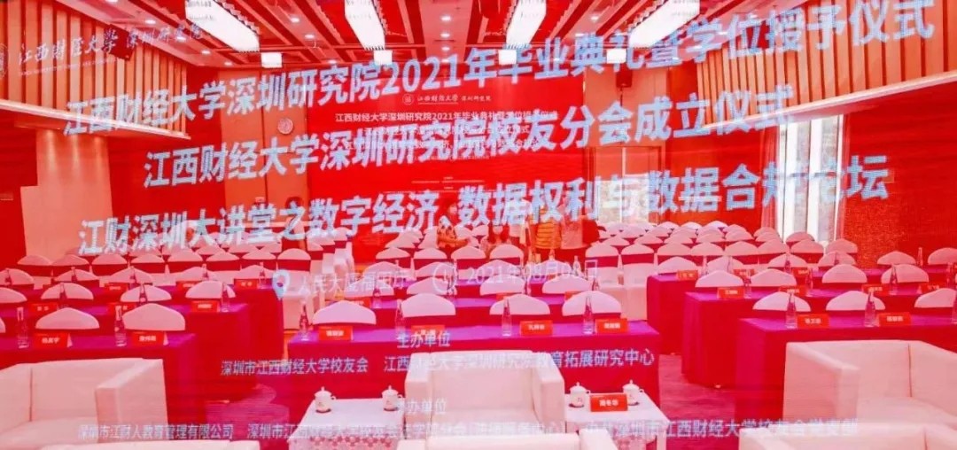 2021年8月8日,江西财经大学深圳研究院、深圳市江西财经大学校友会在福田区人民大厦联合举办了一系列活动,内容包括:江西财经大学深圳研究院2021年毕业典礼暨学位授予仪式、江西财经大学深圳研究院“客座教授”聘任及校友分会成立仪式和江财深圳大讲堂之数字经济、数据权利与数据合规论坛等三个部分。因疫情管控,本次活动现场参与人数做了严格限制,大部分校友通过网络图文直播的方式在线观看了活动全过程。