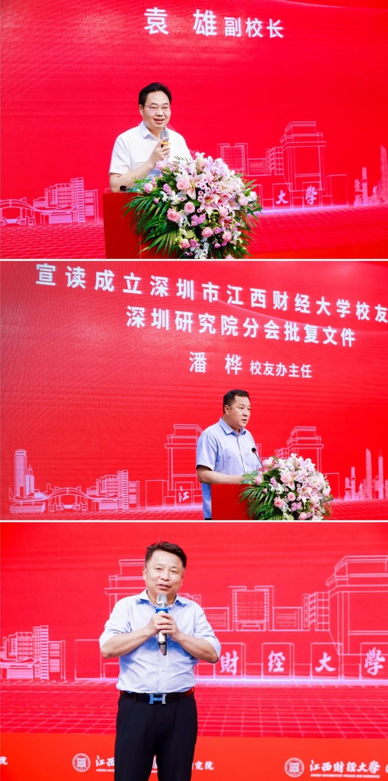 在现场出席活动的校领导和深圳校友会领导有:江西财经大学校党委书记卢福财教授,副校长刘小丽教授、袁雄教授、袁红林教授,工商学院院长胡海波教授,会计学院院长周冬华教授,法学院院长杨德敏教授,深圳研究院院长吴良平教授,校友办主任潘桦老师,法学院蒋岩波教授,深圳研究院办公室主任罗丽老师,深圳市江西财经大学校友会会长李发勇,执行会长兼秘书长詹伟哉(兼任深圳研究院副院长),执行会长周建国、杨高宇等。