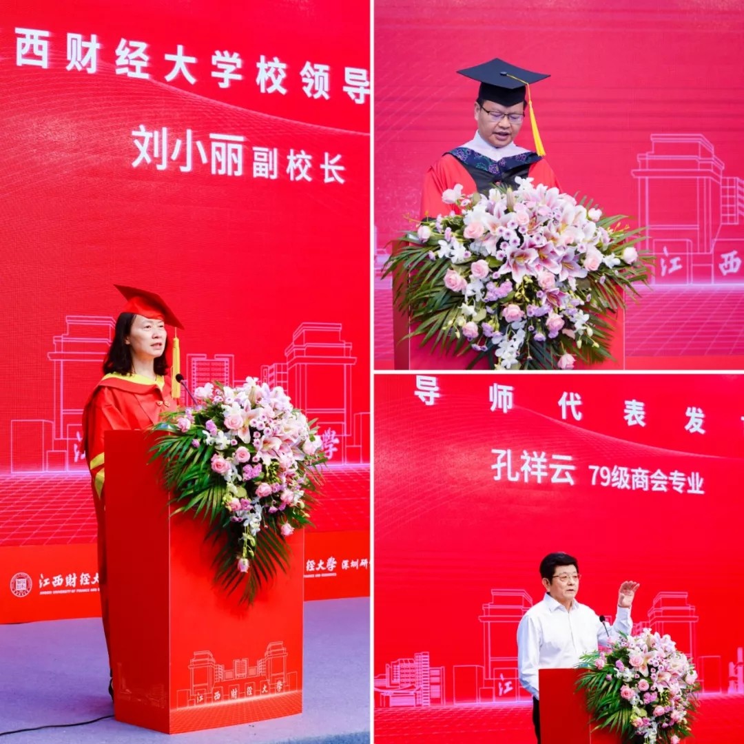 活动首先举行的是毕业典礼暨学位授予仪式,由深圳研究院2020级学生李许诺主持。副校长刘小丽教授致辞,代表学校向全体毕业生表示热烈的祝贺,并提出了希望和要求,与校友、毕业生共勉。随后,在欢快的的音乐声中,副校长袁红林教授上台为2021届深圳研究院毕业生拨穗,并颁发了研究生毕业证和硕士学位证。深圳研究院吴良平院长宣读了《关于颁发优秀毕业生奖励的决定》,吴啸天、刘鸿、涂仲秋等3位优秀毕业生受到了表彰。毕业生代表2018级学生吴啸天发言感谢母校江西财经大学的培养并向老师们行礼致敬。最后导师代表79级商会孔祥云校友发言,他分享了自己的职场经历,并特别告诫同学们在今后的工作中做人要讲原则,做事要有底线。